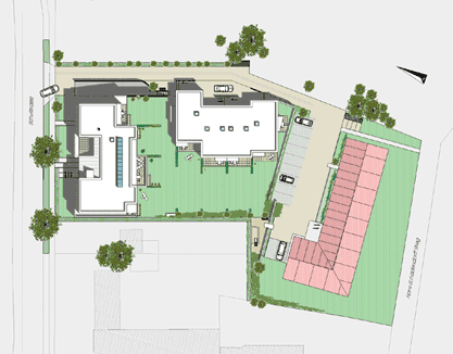 an die Tiefgarage dienen der Unterstützung der Mobilität. Großzügige Terrassen und Balkone sind nach Süden zum geschützten Gartenhof ausgerichtet. Dachbegrünung und die Installation einer Solaranlage tragen den heutigen Ansprüchen an umweltgerechtes Bauen Rechnung. Außerdem entstehen auf dem Grundstück Schulstraße vier Reihenhäuser. Der Zugang erfolgt über einen ruhigen Privatweg. Jedes Reihenhaus besitzt vorne einen abgetrennten gepflasterten Privatbereich. Die zweigeschossigen Reihenhäuser sind voll unterkellert und verfügen über einen direkten Zugang zur Tiefgarage. Zu dem im Westen liegenden Garten gehören sowohl private Terrassen als auch eine gemeinschaftliche Gartenanlage mit angrenzendem Kleinkinder-Spielplatz. |